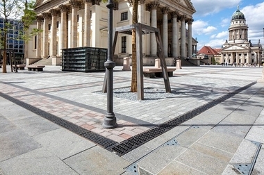 Das Rigolensystem Stormbrixx löst das häufig bei Starkregen auftretende Problem der Überforderung öffentlicher Entwässerungssysteme: Das anfallende Regenwasser wird über Rinnen und Abläufe gesammelt, fließt dann aber nicht in die Kanalisa-tion, sondern in einen Sammelbehälter, von wo es allmählich versickern kann. Revisionen und Spülungen des Systems erfolgen über extra dafür vorgesehene Zugänge.