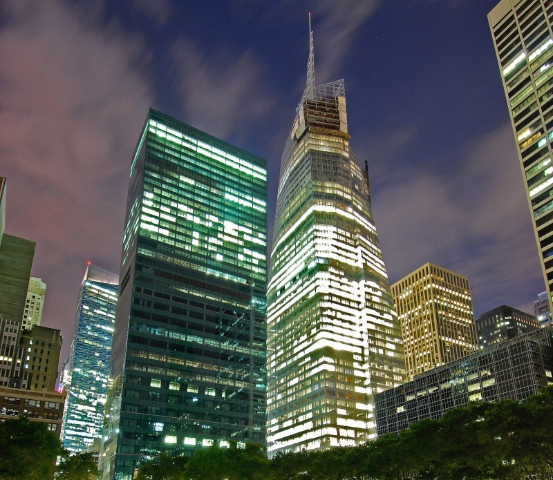 Zuerst fallen die klar ablesbaren Eckdaten ins Auge: Mit der Adresse One Bryant Park besitzt die Bank of America Zentrale ein Filetstück an der 42nd Street direkt am Park. Mit 288 m Gebäudehöhe und weiteren 78 m für die Spitze (die keine Antenne ist und somit der Gesamtgebäudehöhe zugerechnet werden darf) besetzt die BofA nun das zweithöchste Büro in NYC, nur noch übertroffen vom Empire State Building mit seiner Höhe von 381 m. Der Baugrund (0,8 ha) umfasst einen halben üblichen Straßenblock und somit den größten zusammenhängenden Baugrund in Manhattan. Insgesamt 40 Jahre benötigte die Durst-Familie, eine New Yorker Immobilien-Dynastie, um alle Parzellen des Baugrunds zu erwerben. One Bryant Park ist ein Joint Venture von Durst und der Bank of America, beide haben hier Büroräume und sind Gemeinschaftseigner.