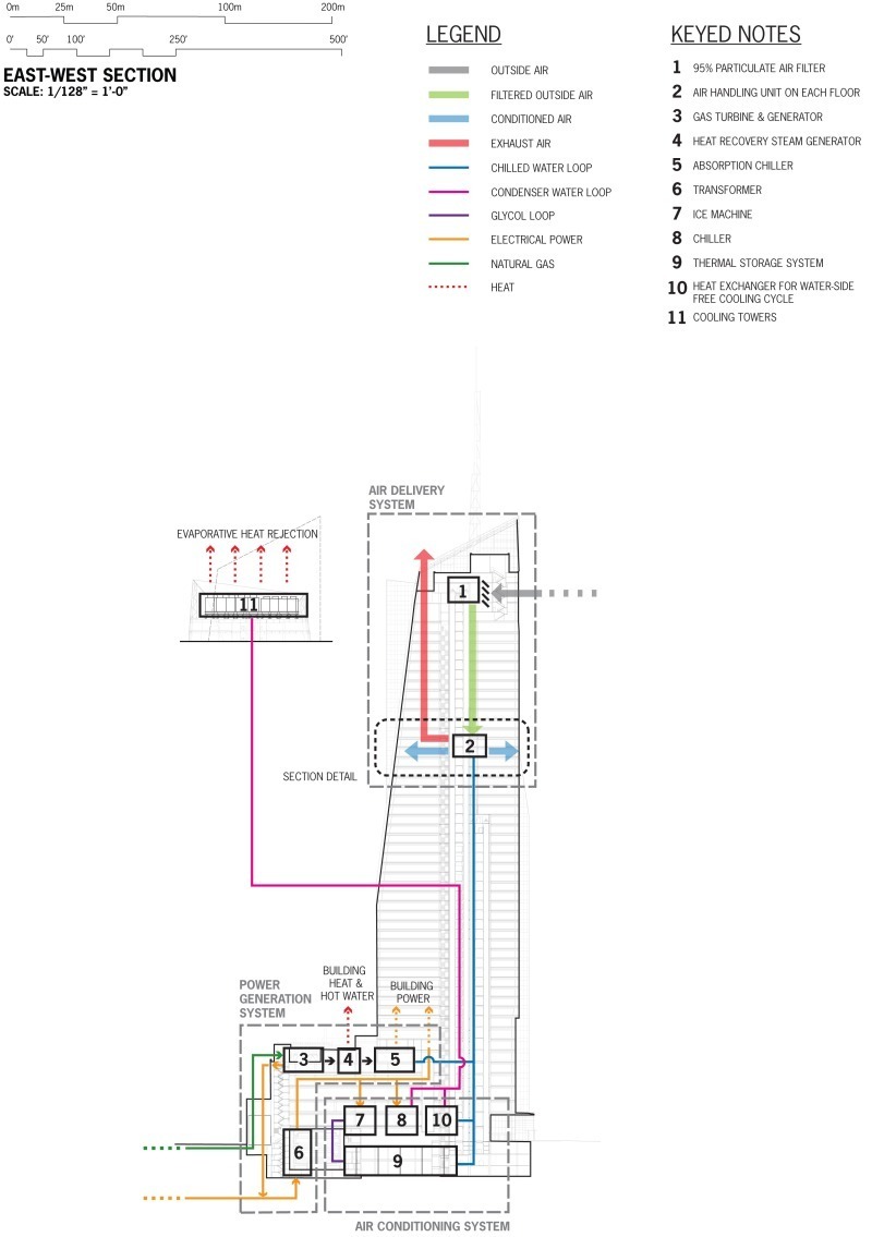 In Manhattan sind es wegen des geringen Individualverkehrs sogar 79 %. Hier setzt das hauseigene Gaskraftwerk im Keller an, das mit seiner Leistung von 4,6 Megawatt den größten Teil des Gebäudeenergiebedarfs deckt und obendrein kaum Abgase produziert. Der Vorteil liegt im weitaus geringern Energieverlust: Bei Kraftwerkstrom gehen 73 % der Energie auf dem Weg zum Endabnehmer verloren, hier nur 23 %. Ein wichtiger Aspekt ist die Nutzung der Abwärme bei der Energieproduktion, die hier zum Heizen und, umgewandelt, zum Kühlen der 180 Glykoltanks im Keller genutzt wird. Die zusätzlich benötigte Energie zum Einfrieren des Glykols wird über preiswerten Nachtstrom gewährleistet. Das Glykol speichert bei Nacht die Kälte, die bei Tage zur Kühlung der Büroräume benötigt wird. Bei der größten Mittagshitze, wenn NYC wegen der vielen Klimageräte den höchsten Energiebedarf hat, kommt One Bryant Park ganz ohne zusätzliche Energie aus.