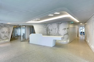 Eine Bank als urbane Lounge, die eher an eine gehobene Boutique denken lässt – so stellte sich die Raiffeisenbank Zürich die Umsetzung ihrer Kundenphilosophie vor. Der Innenbereich der Open Lounge, der von dem Zürcher Architekturbüro NAU und dem Studio Drexler Guinand Jauslin gestaltet wurde, verbindet die verschiedenen Bankbereiche zu einem optischen Kontinuum, das sich vom Kundenempfang im vorderen Teil bis zu den zum Hof hin orientierten Arbeitsplätzen der Angestellten erstreckt. Die Wände dienen dabei als Membran, die zwischen den offenen öffentlichen Räumen und den sorgfältig abgeschirmten Besprechungszimmern vermittelt. Die traditionellen Barrieren zwischen Kunden und Angestellten werden aufgehoben. So entsteht der Typus einer neuartigen „offenen Bank“ mit einem großzügigen Begegnungsraum. Banktypische Infrastruktur ist weitgehend unsichtbar. Die Angestellten greifen auf Terminals zu, die im Mobiliar versteckt sind, ein roboterbetriebenes Abrufsystem gewährleistet rund um die Uhr Zugriff auf die Schließfächer. An den mit Touchscreens ausgestatteten Medientischen lassen sich Weltmarktzahlen in Echtzeit darstellen und interaktiv nutzen. Auf Wunsch finden private Beratungen in einem der Besprechungszimmer statt. Die Wandgestaltung greift die kulturelle Vergangenheit des Gebäudes auf: Portraits von prominenten ehemaligen Bewohnern des Quartiers – Arnold Böklin, Gottfried Semper oder Johanna Spyri wurden vom auf digitalisierte Fertigung spezialisierten Büro Rippmann Oesterle Knauss entwickelt und von Rosskopf & Partner verarbeitet. Die Wände sind aus dem Solid Surface Mineralwerkstoff HI-MACS® gefertigt, die Portraits mit Hilfe von Digitaltechnik eingefräst. Dank der Eigenschaften des Mineralwerkstoffs HI-MACS® konnten die fließenden Wände erstellt werden. Das Material besitzt eine ähnliche Festigkeit wie Stein, lässt sich aber wie Holz be- und verarbeiten. Die Platten in der Farbe Alpine White kamen in 12 mm Stärke zum Einsatz.