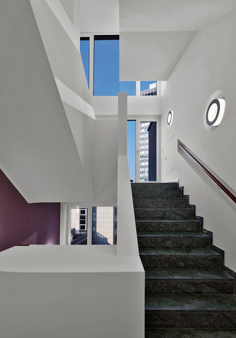 Präzise Übergänge und Details verbinden Alt und Neu: Runde „Plug-In“-Steine leiten vom neu verlegten, grünen Marmorboden im Eingangsflur zu den Betonwerksteinstufen im Treppenhaus. Der Holzhandlauf der Treppe läuft sich nicht tot, sondern schließt im 6. Obergeschoss mit einem bündig in die Gipskartonbrüstung eingearbeiteten Kopfstück ab. Man spürt, es ist ein „Haus des Handwerks“.