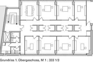 Nischen zwischen den vorhandenen Betonstützen. Die Handwerkskammer im 1. Obergeschoss teilte den Raum dagegen dreibündig auf – mit einer breiten Mittelzone für Aktenlager und Kopierer. Durchgänge und große Glasfenster zu den Büros eröffnen Sichtachsen von der Straßenseite bis in den Hof. Abgehängte Decken mit Lichtvouten kaschieren die Deckenträger und gliedern den Raum in höhere und niedrigere Abschnitte. Im 2. Obergeschoss haben Maler- und Zahnarztinnung separate Zugänge. Die Flure weiten sich jeweils mäanderförmig, so dass der Stauraum abwechselnd je einer der beiden Parteien gehört. Theoretisch lassen sich auf Höhe der Stützen sogar noch kleinere Einheiten abtrennen.