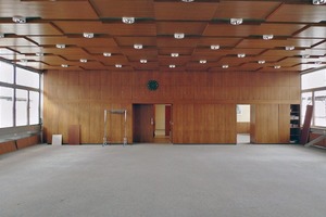 Dieses Wegblenden der Technik fokussiert den Blick auf die räumlichen Qualitäten des Hauses. Das zeigt sich eindrücklich auch im Großen Saal der Handwerkskammer im 6. Obergeschoss: Turkali Architekten verwandelten den holzvertäfelten, technisch veralteten Saal in einen hellen, multifunktionalen Veranstaltungsraum für Schulungen, Unterricht oder Mitgliederversammlungen. Dank mobiler Schiebewände aus Glas und weiß lackiertem MDF lässt sich der Raum in zwei Säle mit separaten Eingängen teilen. Oder in einen Saal mit seitlich abgetrenntem Buffet. Die Trennwände parken in einer „Wandgarage“ im Rücksprung zum Nachbargebäude. Sie lassen sich vollständig in einer vorgeblendeten Wand aus MDF-Schlitzplatten versenken. Die rückseitig gelochten Wandplatten verbessern zugleich die Raumakustik und nehmen die Lautsprecher auf. Die gesamte Saaltechnik lässt sich über ein iPad steuern, spezielle Lichtsituationen, etwa für Prüfungen, sind voreingestellt.