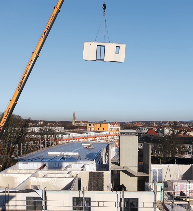 Die Gesetzeslage macht mehrgeschos sigen Holzbau besonders für den verdichteten innerstädtischen Bereich als effiziente und zugleich Ressourcen sparende Bauweise für Aufstockungen im Bestand oder als Neubau interessant. In Regensburg zeigt ein viergeschossiges Wohn- und Geschäftshaus mit 5386 m² Bruttogeschossfläche, dass selbst mehrstöckige gewerbliche Gebäude in Holz fertigbauweise erstellt werden können. Grundsätzlich überzeugt der Holzbau durch mehrere positive Eigenschaften: zu den ökonomischen zählen geringes Gewicht, hoher Vorfertigungs grad und kurze Bauzeit. Hinzu kommen ökologische: Neben der aktuellen Klimadiskussion rückt die andauernde Debatte zur Verminderung des Ressourcenverbrauchs die positiven Eigenschaften des nachwachsenden Baustoffs Holz in den Vordergrund. So gilt es unter Fachleuten, wie z.B. Klaus Richter, Holzfachmann an der Empa1, als erwiesen, dass eine vermehrte Verwendung von Holz im Bauwesen eine nachhaltige Aufforstung von Wäldern bewirkt. Auch unter primärenergetischen Aspekten gilt Holz als nachhaltiger Baustoff. Für Gewinnung, Bearbeitung und dem Einbau von Holz wird weniger Energie eingesetzt als bei Baustoffen wie Stahl, Zement, Kunststoff oder Aluminium. Hinzu kommen emotionale Aspekte der Nutzer, die Holzbauweise gefühlsmäßig mit einem natürlichen und gesunden Raumklima verbinden.