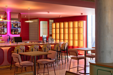 Blickpunkt im Innenraum ist die elliptische Bar. Deren Rückwand greift die Bruchsteinoptik der Wände wieder auf, allerdings abstrahiert in Form von übereinander geschichteten, verklebten Glasscheiben. Der Tresen selbst besteht aus Corian, das mittels thermischer Verformung in der zweiseitig gekrümmten Gestalt hergestellt wurde.