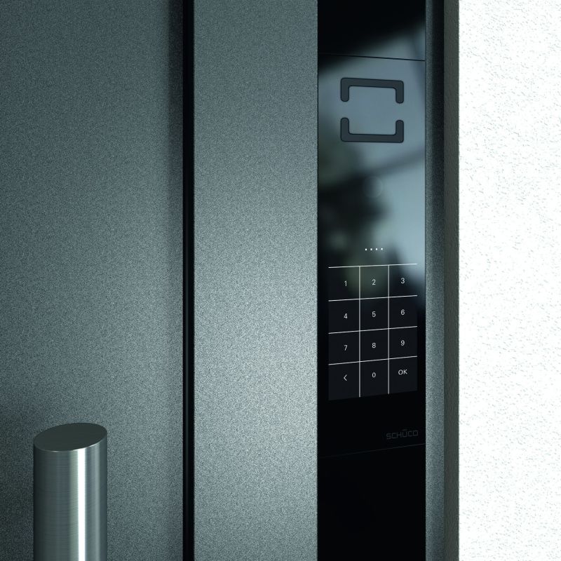 Das neue Touch Display des Schüco Door Control Systems (DCS) ist in das Türprofil integriert und lässt sich intuitiv wie ein Smartphone bedienen. Es vereint sämtliche Funktionen der Türkommunikation mit denen einer Zutrittskontrolle: Hausnummer, scrollbare Klingelleiste, Zahlencode, Sprechanlage mit Videokamera und Türöffner sind Bestandteile des Systems. Das Schüco DCS Touch Display bietet eine flächenbündige Profilintegration im Blendrahmen oder Türflügel. Auf Wunsch lässt es sich auch auf Putz oder auf einem Paneel an der Wand montieren.