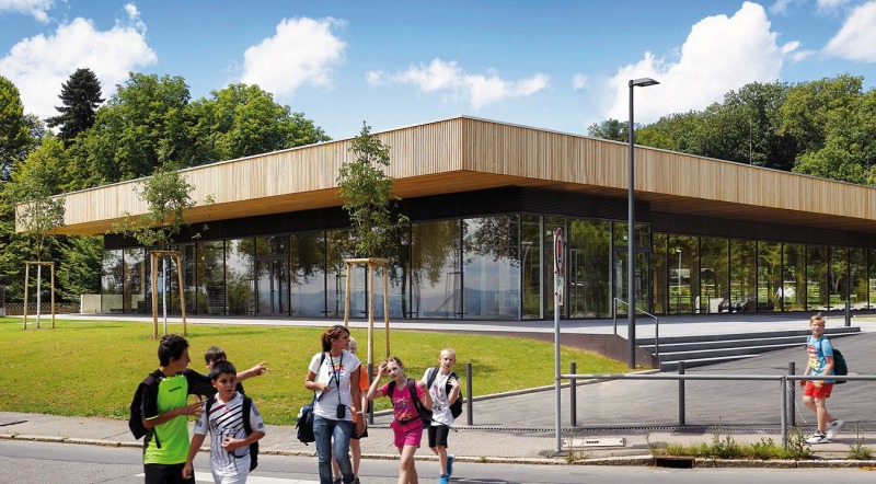 Sportler sind es, keine Künstler. Die neue Sporthalle in Esslingen am Neckar von Glück+Partner, Stuttgart, steht im Grünen. Und weil das große Volumen das Grün nur wenig beeinträchtigen sollte, wurde die Mehrfeldsporthalle transparent. Die schwebende Dachkonstruktion (Holz) hinter der hellen Holzverschalung deckt das in die Erde gegrabene Sportfeld. Durch dessen Absenkung in den Boden wird auf einfache Weise die immer schwierige Blendsituation bei ebenerdig gelegenen Flächen hinter Glas gelöst.