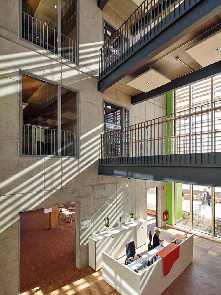 zueinander angeordnet, dass sie einen Innenhof bilden. Die Fassade ist mit viel Glas, Grün sowie Lärchenholz gestaltet. Innen bleibt die Holzkonstruktion unverkleidet,