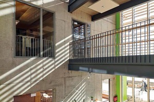 der Werkstoff Holz ist das gestalterische Element. Die offene Raumlandschaft mit ihren verglasten Fluren erhält viel Tageslicht und ermöglicht den Blick nach draußen – natürlich von jedem Büro aus, aber auch aus den Mittelzonen mit den Meetingpoints heraus.