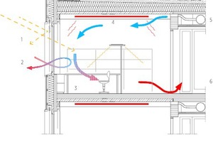 Das erklärte Ziel war ein möglichst einfaches technisches Konzept. Deswegen wurde die Gebäudehülle entsprechend dem Passivhaus-Standard erstellt. Die U-Werte der opaken Bauteile liegen zwischen 0,11 und 0,17 W/m²K, die U-Werte der Fenster liegen bei 0,9 W/m²K. Für die passive Nutzung von Wärme- und Kühlenergien sorgen die thermischen Gebäudemassen in den Bürobereichen.