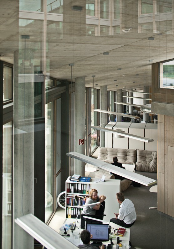 Ein effizientes Beleuchtungsmanagement durch Tageslichtsensoren und Präsenzmelder sowie eine DALI gesteuerte, dimmbare Beleuchtung trägt sein Übriges bei, dass hier viel Energie gespart wird. Taghell, freundlich gestaltet und möbliert sind alle Arbeitsbereiche wie auch im angeschlossenen Produktionsgebäude, wo man den hochqualifizierten Arbeitnehmern ein Optimum an Kontaktmöglichkeiten verschaffte. Schließlich wird hier in einem 24-Stundenbetrieb weltweit agiert, weshalb ein Casino, Lounges und andere abwechslungsreiche Erholungsbereiche in den unterschiedlich gestalteten Höfen umso wichtiger waren.