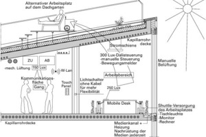 Dazu besteht die vorgefertigte Hybridfassade aus vorgefertigten Tannenholzrahmen. In diese Fassade wurde eine stehende Dreischeibenverglasung mit Sonnenschutzbeschichtung mit einem Uw= 0,9 W/m²K, ein außenliegender Sonnensschutz aus Lamellen mit Lichtlenkungsfunktion sowie manuell zu öffnenden Fensterflügel mit integriertem Vakuumpaneel von 3 cm Stärke installiert. Ein Schallschutzvlies und ein Lochblech an der Innenseite und horizontale Holzlamellen als Wetterschutz sind weitere Bestandteile der Hybridfassade, die unter den Fenstern noch kleine Heizvektoren als schnell reagierendeZusatzheizung erhielt. Über einen Medienkanal an der Geschossaußenkante angeschlossen, sind dazu in einigen Fensterelementen Controller-Units installiert, welche die Fassadensteuerung koordinieren und über Touchpaneels oder die Desktops von den Mitarbeitern gesteuert werden.