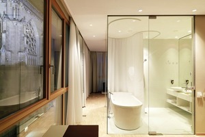 Diese Sprache heißt Gotik und steht für das Auflösen des Baukörpers in seine Tragstruktur. Wo der Dom mit Naturstein und bleiverglasten Öffnungen arbeitet, setzt das Domhotel zeitgemäß auf beigen Sichtbeton und Vollverglasungen in filigranen, geölten Lärchenholzrahmen. Der fünfgeschossige Skelettrahmenbau ist deutlich durch Fugen gegliedert, die die vertikalen Elemente von den horizontalen absetzen. Die vertikale Struktur, eigentlich das zentrale Thema der Gotik, wird in dem Neubau nochmals durch die Verjüngung nach oben hin aufgegriffen. Leichte Knicke in der Fassade nehmen vorhandene Richtungen und Bezüge auf und resultieren in einer mehrfach gebrochenen Spiegelung der Domfassade. Der Eindruck eines Solitärs auf einem Tablett wird durch die besagte Schattenfuge, die – wenn auch leicht gestörte – Gleichmäßigkeit der Fassade und den völligen Verzicht auf Brückenelemente zur Verzahnung mit dem Kontext verstärkt: Es gibt kein Vordach, keinen betonten Eingang, keinen Appendix oder Erker, keine speziellen Terrassen und keine Grünanlagen. Im Erdgeschoss gibt es lediglich auf der Südseite einen Arkadengang, sowie einen einspringenden Freisitzbereich auf der Nordostecke.