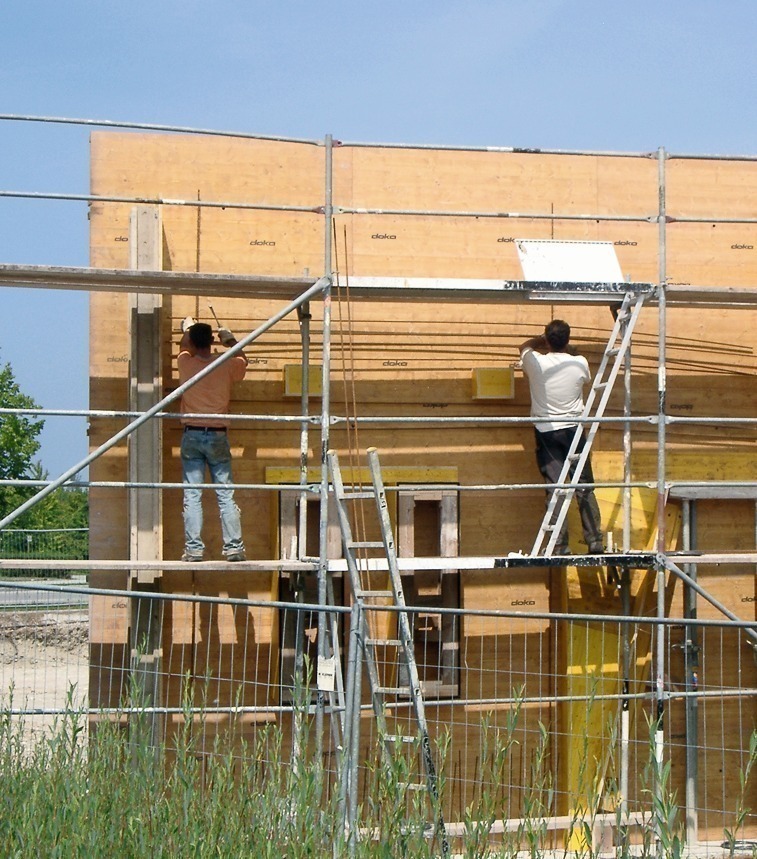 Als Fassade und Außenwand realisierten die Architekten eine tragende 32 cm starke Betonschale, die komplett ohne Fugen mit Ortbeton in hoher Sichtbetonqualität hergestellt wurde. Der Rohbauer wählte größt-mögliche Schaltafeln und belegte das Schalsystem vollflächig mit Betonplan, um sichtbare Stöße weitestgehend zu minimieren und den homogenen Gesamteindruck zu verstärken. Die Spannankerlöcher wurden farblich abgestimmt verspachtelt. Außerdem wurde die gesamte Außenwandfläche mit über 1 100 m² von einem spezialisierten Fachbetrieb gestockt. So sind Schalbild und Ankerlöcher kaum zu sehen und die Fassadenansicht zeigt eine grobkörnige Oberflächenstruktur, die die natürliche Wirkung unterstreicht. Innenseitig erfolgte der Aufbau mit Wärmedämmung, Vormauerung mit KS-Steinen sowie einem durchgefärbten zweilagigen Innenputz, der ebenso wie die Außenfassade in einem Beigeton eingefärbt wurde. Die Geschossdecken und das Dach liegen abgekoppelt von der Außenwand nur über einzelne Auflagerkonsolen im Abstand von 3 m auf der äußeren Sichtbetonhülle auf.