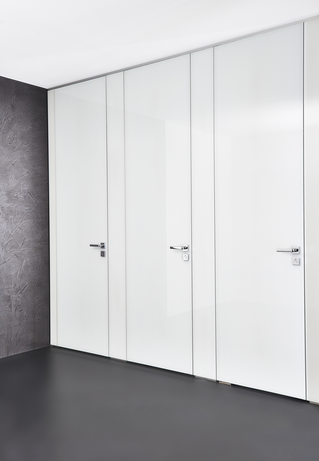 Die raumhohen WC-Trennwände Vento von Schäfer eignen sich insbesondere für hochwertige Sanitärbereiche. Die flächenbündigen Glasfronten sind ohne sichtbare Beschläge und Profile. Die Trennwand besteht aus einer 50 mm starken, verwindungssteifen Sandwichkonstruktion mit beidseitig 5 mm starken ESG-H Scheiben und wird durch einen innenliegenden Aluminiumrahmen stabilisiert. Die Türen sind bis zu einer Höhe von 3 m in einem Stück ausführbar und in vielen RAL Farbtönen erhältlich. Eine integrierte Soft-Close Funktion sorgt für lautloses Öffnen und Schließen der Türen.