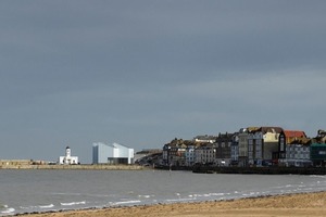 Sechs dem Küstenverlauf nach gestaffelte, zweigeschossige Kunsthäuser auf einem Betonsockel: Ihre geneigten Flachdächer mit Oberlichtern grüßen selbstbewusst in Richtung See; zu welcher die Häuser der ersten Reihe über monumentale Fenster geöffnet sind. Turner, häufiger Gast in Margate, hätte diese wetterfesten Panoramaplätze zu schätzen gewusst! Be. K.