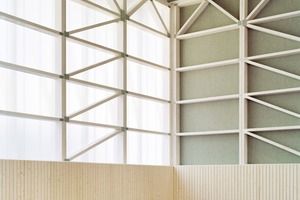 Neu ist die Herangehensweise der Planer, das vorhandene System auf seine ästhetische Tauglichkeit zu überprüfen. Es entsteht das Bild eines Raumfachwerks, was es aber gar nicht ist, oder einer bildhaften Wandgrafik. Es gleicht einem Suchspiel, welche Elemente tatsächlich statisch notwendig fürs Tragwerk sind und was „nur“ Dekor ist. Es gibt sozusagen eine Hierarchie der prägenden Elemente. Die, die für das Konzept wichtig sind, kamen vorgefertigt aus dem Werk und sind unverhandelbar. Oder so weit optimiert, dass ein Bild von Leichtigkeit erzeugt wird, trotzdem aber enorme Kräfte dahinterstehen. Wie z. B. die filigranen Streben an der Nordwand vor der Polycarbonatfassade. Was nach Dekor aussieht, trägt dank eines statischen Kniffs, nämlich die Lasten durch das geschlossene Dreieck in den Sparren zurückzuführen. Dagegen ist die zweite Ebene der Gesamterscheinung untergeordnet. „Eine graue sägeraue Schalung ist nicht darauf angewiesen, dass jede Fuge perfekt ist – alles andere ist Fetisch“, lacht Florian Fischer. Aber es geht auch ums Dekorative, um die leichte Unschärfe und Irritation. Dies wird besonders deutlich an der Süd-Westseite der 44 m langen Halle, bei der zur Aussteifung und zugunsten des horizontalen Fensterbandes ein Stahlbetonbinder über die gesamte Länge eingezogen wurde. Die eigentliche tragende Konstruktion aus Stahlstützen in jedem zweiten Feld wurde hinter einer OSB-Platte mit Teppichbespannung für die Akustik versteckt, jedoch über eine zweite Schicht dünner, in ihrer Optik und Raster der Nord-Ostseite entsprechenden „Holzapplikation“ fürs Auge ergänzt.