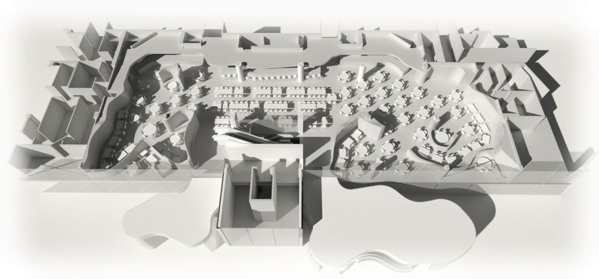 Ein- und Ausgang sind unterschiedlich groß, was der unterschiedlichen Geschwindigkeit der Ankommenden und Gehenden geschuldet ist. So werden sich im Eingang viele noch an die Theke setzen, hinter der ein großer Screen alles Mögliche zeigen kann. Ebenfalls ist hier ein Counter für den ersten Empfang untergebracht. Die gewellten Gläser innen wechseln mit Gipskartonflächen. Beide dienen dazu, Vor- und Rücksprünge im Rohbau des Bestands zu kaschieren. Die Mischung Glas/Gipskarton resultiert aus den unterschiedlichen Funktionen wie Reversibilität und Akustik.