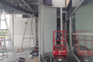 Die Scheiben aus 20 mm Verbundsicherheitsglas, bestehend aus zweimal 10 mm teilvorgespanntem Glas mit opaker Folie, stehen beweglich auf zwei Kunststoffstäbchen, die wiederum in einer Stahlrinne gehalten werden. Diese Rinne ist Teil einer Gesamtstahlbaukonstruktion, die nicht nur die Innen- und Außenscheiben aufnimmt, sondern auch die Lichttechnik, Lüftung, Entwässerung etc. Die dem Fassadenverlauf folgende Stahlkonstruktion, die auf einem Flächenfundament aufliegt, musste zudem auf die Geländeneigung reagieren. Während die Scheiben unten also spannungsfrei gelagert sind, werden sie oben über demontierbare Bleche geklemmt.