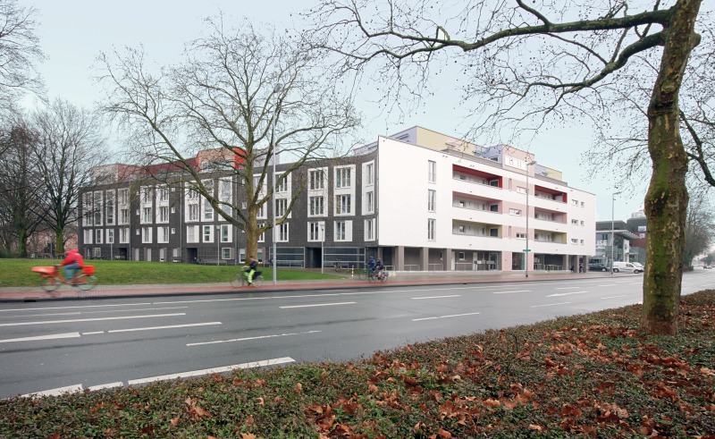Zwischen einem Park mit darin locker verteilten alten Platanen und Buchen auf der einen Seite und einem Autohaus in Glas-/Stahloptik auf der anderen Seite hat das Münsteraner Büro BOLLES+WILSON einen Wohnungsbau platziert, der unterschiedlichste typologische Themen in sich vereint, und hat manches davon, was gewohnt und erwartbar erscheint, auch ganz anders gemacht.