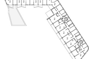 Ganz anders das horizontal gegliederte Volumen, das sich zur Straße hin als eine beinahe blendweiße Wandscheibe hinter Putz zeigt. Das Horizontale erzeugt die Laubengangerschließung, die vielleicht die Baukosten gesenkt hat, die aber auch der Distanzierung der Wohnräume vom lauten Straßenraum dienen kann. Auch hier animieren Pastellfarben (rosa!, violett, gelb) auf dem Dach und dem Aufzugs- und Treppenturm sowie unter den Decken der Laubengänge. Gerade letztere Farbigkeit wirkt sehr indirekt und überrascht in ihrem ständigen Wechsel von Intensität und Streuung. Die zum Laubengang weisenden Fenster belichten Küchen und Bäder. Hier sind die Wohnungen zwischen 45 m² und 90 m² groß, die Räume allerdings im Schnitt kleiner wie ebenso die Balkone, die mit 5 m² etwa auf die Hälfte bis zu einem Drittel der Balkonflächen auf der gegen-überliegenden Schenkelseite kommen. Auch hier gibt es einzelne Wohnungen mit innenliegenden Küchen und Bädern.