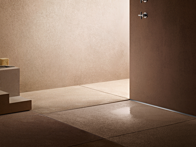 Akzente mit einer Ablaufschiene aus Edelstahl. CeraWall P – mit Ablaufprofil – steht für Minimalismus und realisiert nahezu unsichtbar den fließenden Übergang zwischen Boden und Wand. Das Ablaufgehäuse von CeraWall ist eingegossen in einen Polymerbetonkragen mit Baustahlmatte und gewährleistet höchste Sicherheit beim Einbau und der Integration in die Verbundabdichtung.