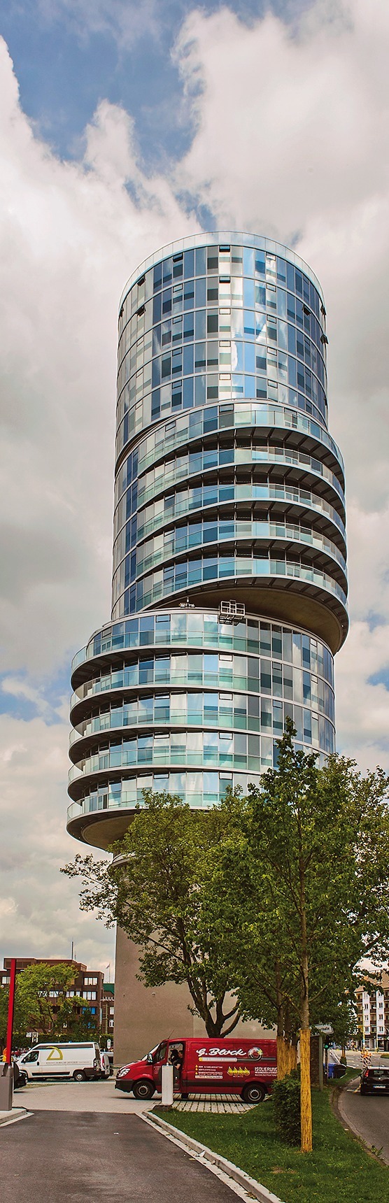 Zu den üblichen Anforderungen des Hauptdaches in 84 m Höhe gesellten sich neben der Windsogsicherung ein bauseits vorhandenes, verschobenes und unterschiedlich geneigtes Gegengefälle sowie der teilweise mit erheblichen Höhenunterschieden ausgebildete Dachrand. Relativ früh stand fest, dass die insgesamt rund 730 m² umfassenden Dächer mit einer hochwertigen Kunststoff-Dachabdichtung auf der Basis von Polyisobutylen (PIB) abgedichtet werden sollten. Das gesamte Dachschichtenpaket wurde vollflächig verklebt. Zum Einsatz kam die Dachbahn Rhepanol® fk. Sie verfügt sowohl über ein integriertes Kunststoffvlies als auch einen industriell vorgefertigten Dichtrand und über eine Kälteflexibilität bis - 60° C. Im Dachsystem erfüllt sie die geforderte Widerstandsfähigkeit gegen Flugfeuer und strahlende Wärme.