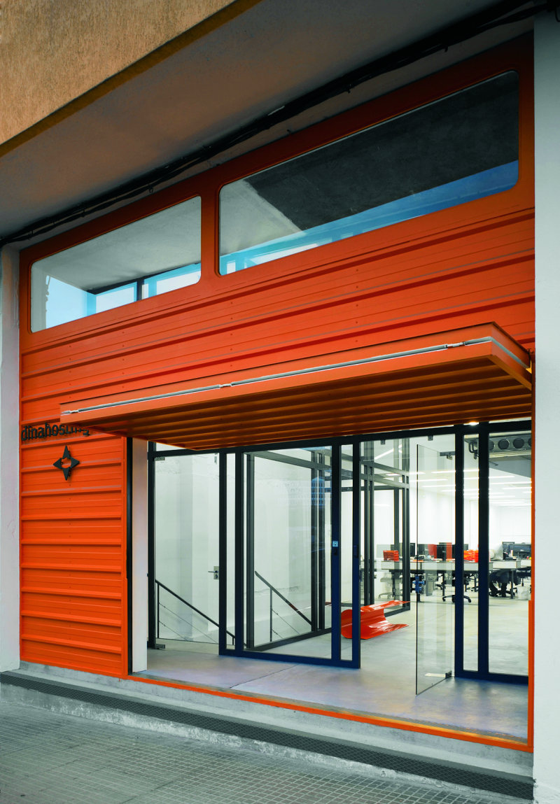 In einer der Ausfallstraßen von Santiago leuchten in der Firmenfarbe Orange die Verkleidung und das Vordach eines Schaufensters zwischen benachbarten Garageneinfahrten und Kfz-Werkstätten. Die große Fensterfront bietet Einblick in die obere, erdgeschossige Ebene der rund 860 m2 großen Bürofläche. Der Boden aus hellgrauen Betonfertigteilen ist unverkleidet, deutlich erkennbar bleiben die Stoßfugen. Die Betonwände strahlen in weißem Wandanstrich. Drei Transportcontainer, wie zufällig abgestellt, zonieren den Raum in verschiedene Funktionsbereiche, die im hinteren Teil des Raumes lediglich über eine große Glasfläche abgetrennt werden, ansonsten aber nahtlos ineinander übergehen. Die Arbeitstische stehen wie Werkbänke hintereinander gereiht auf metallenen Füßen und bieten jeweils Platz für zwei bis drei Arbeitsplätze. Vom Eingang aus blickt man den jungen Gesichtern der Mitarbeiter und den verkabelten Rückseiten ihrer Bildschirme und Rechner entgegen. Unverkleidete Leitungen zeigen sich an der Wand, einfache Neonröhren hängen schräg von der Decke. Die Farbigkeit ist auf Grau, Weiß, Schwarz und das Corporate-Orange der Firma reduziert. Es entsteht ein Bild von Improvisation und Pioniergeist, ein hierarchieloser und transparenter Raum, der einzig dem Zweck dienen soll, den kreativen Mitarbeitern die notwendige Arbeitsinfra-struktur zu bieten.