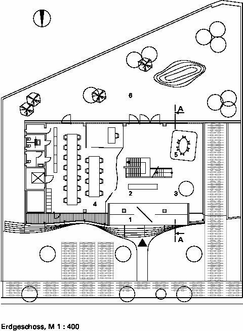 Einen Ruhepunkt in diesem bewegten Wellenspiel bildet die Eingangssituation: ein Rahmen aus Sichtbeton schiebt sich in die weiche Linienführung der Fassade, inszeniert die Schwelle zwischen innen und außen. Hier verschmelzen fließende Linien mit der klaren formalen Sprache des dahinterliegenden Baukörpers. In geschwungenem Bogen stößt sich die Fassade am Boden vom Gebäude ab, weitet sich zu einer einladenden Treppe auf, über die man durch das verglaste Portal in die Halle der Agentur tritt.