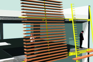 Gebogene Doppel-T-Träger sind durch Stahlstäbe von der Stahlbeton-Glas-Fassade des minimalistischen Kubus abgehängt und bilden die vertikale Tragstruktur der Holzfassade. An den Trägern angeschweißte Stahlprofile nehmen die horizontale Struktur der wellenlinienförmig zugeschnittenen Zedernholzplanken auf.