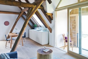 Alle Zimmer haben einen Außensitz. Im Dach von Haus 1 sind die Zwerchhäuser rekonstruiert und die Fassadenebene dabei nach innen versetzt, sodass eine kleine Loggia entsteht. Platzsparende Glasschiebetüren öffnen sich zur Loggia, deren Seitenwände in Trockenbauweise mit wasserbeständigen Paneelen verkleidet sind. Im Haus 2,