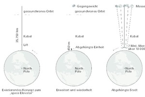 ZERO CITY setzt nun die Idee einer entwurzelten Megacity fort, indem sie ein bestehendes Konzept, den „Space Elevator“*, übernimmt, um eine neue städtebauliche Situation zu schaffen. Das Umkreisen einer großen Masse in einer Ebene mit einer geosynchronen Umlaufbahn soll nach Vorstellung von Clouds Architecture Office durch das Abhängen an Kabeln ermöglicht werden, die ein Gebäude halten könnten. Dieses System funktioniert wohl nur entlang des Äquators und nutzt die maximale Zentripetalrotation der Erde für eine stabile geosynchrone Umlaufbahn. Indem die Planer eine Reihe von Massenobjekten in der Umlaufbahn nutzen wollen und an einer Vielzahl von Kabeln fixieren, könnten sie eine ganze Stadt einen halben Kilometer über dem Boden schweben lassen, – nach ihrer Einschätzung eine ideale Höhe, in der die Temperatur für menschliche Behaglichkeit ohne mechanische Heizung oder Kühlung geeignet ist.