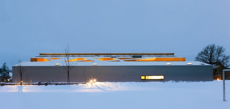 Das Umfeld ist sehr inhomogen. Streusiedlungen, Bauernhöfe, Felder. Das Polytechnikum und eine Sportschule säumen die Zufahrt im Nordwesten. Wie ein Flügel ragt das trapezförmige Dach mit dem eingeschnittenen Oberlicht weit auf das Trottoir: So können die Busse im Trockenen halten. Fast 18 m lang, überbrückt es den Weg zum Foyer und bildet einen gedeckten Vorplatz. Hier können sich viele sammeln und warten, falls es drinnen eng wird. „Die Gegend ist nichtssagend. Unser Gebäude reagiert darauf, indem es sich nach innen orientiert“, so Tinchon. „Wir wollten ein Volumen bilden, das von einem Kommunikationshof durchschnitten ist.“