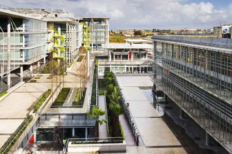 Die Architekten teilten das Volumen in sieben flächige Gebäude und versetzen sie zueinander, so dass zwei Reihen und ein mittlerer Freiraum als Fortsetzung der Landschaft entstehen. Die Südansicht scheint mit nur drei sichtbaren Ebenen über der Landschaft zu schweben. Tatsächlich sind sie vier Geschosse, die nördlichen Gebäude sechs bissieben Geschosse hoch. Eine Veränderung der Topographie lässt sie niedriger wirken: Die Architekten versenkten die unteren Ebenen als offene Parkdecks teilweise unter das Bodenniveau und teilweise unter eine erhöhte B-Ebene, die Eingangsebene des Areals. Runde Betonstützen tragen die Bürogebäude darüber, auskragende Geschossdecken und Dächer betonen die Horizontale. Die einzelnen Bauelemente, Treppe, Dach, Fassade und Eingänge, fügen sich in jeweils baugleichen, seriellen anmutenden Elementen zusammen wie bei einer Maschine. Die ingenieurtechnische Ästhetik ist typisch für die Projekte beider Architekturbüros, dennoch verweisen die Architekten auf die regionalen Elemente im Gebäude. Zum einen orientieren sich die Farben des Bauwerks an der andalusischen Fliese: ein Zitronengelb bei den Treppen, ein Ultramarinblau an den Eingängen und auf der Unterseite der Sonnenschutzlamellen, dazu vereinzelt Akzente in Signalrot. Sonst dominieren die materialeigenen Farben von Metall, Stahl, Aluminium und Sichtbeton. Zudem erinnert die städtebauliche Fügung von dicht stehenden Baukörpern mit engen Gassen und Arkaden und einer mittigen, baumbestandenen Rambla an spanische Altstädte. Energetisch ist dies sinnvoll; die Gebäude verschatten sich gegenseitig und minimieren so den Energieeintrag. Darüber hinaus planten die Architekten zwei Fassadenebenen, um das Gebäude vor Überhitzung zu schützen. Die eine besteht aus Metalllamellen, die an der Außenkante der weit auskragenden Sichtbetondecken eine vor Sonne schützende Hülle bilden. Sie brechen an ihrer Oberseite das einfallende Licht und leiten es als indirektes Tageslicht tief in die Büroräume. Ihre blau eingefärbte Unterseite verhindert Blendreflexe. Ein Metallvorhang verschattet die rückversetzten Eingänge der Gebäude. Die innere Fassadenebene ist eine Glasfassade mit fest eingebauten Aluminiumpaneelen, die die Fassade horizontal auf Hüfthöhe und unterhalb der Decke begleiten. Diese schützen vor Blendeffekten bei niedrig stehender Sonne im Winter. Zusätzlich sorgen auskragende Dächer und überdachte Zwischenräume für Schatten.