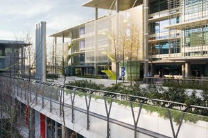 Die soll auch durch gemeinsame Freizeit- und Serviceeinrichtungen gestärkt werden. Das Unternehmen bietet auf dem Gelände ein Fitnessstudio, einen Mini-Supermarkt, ein Arztzentrum, einen Kindergarten und einen Bereich mit verschiedenen Restaurants an. Ziel dabei ist, dass die Mitarbeiter über ihre lange Mittagspause hinweg nicht, wie in Spanien üblich, nach Hause oder in die Innenstadt fahren, sondern die fußläufige Infrastruktur auf dem Campus nutzen. Die Freiflächen gestaltete die Landschaftsarchitektin Maria Medina Muro, zusammen mit Estudio 28. Unterschiedlich gestaltete Freiräume steigern den Aufenthaltswert auf dem Gelände. Der Campus als eigener Kosmos, ökologisch ist dies sinnvoll, zeitlich ist es ökonomisch, denn es bedeutet kurze Wege. Eine Brücke über die Autobahn verbindet das Gelände mit dem Wegenetz zur Innenstadt, die Fahrt zur Arbeit mit dem Rad soll so attraktiver gemacht werden. Eine Herausforderung bei sommerlichen Temperaturen von weit über 30 Grad. Aber nicht allein pragmatische Gründe begründen das Streben nach Nachhaltigkeit auf dem Campus, es gehört zur Firmenphilosophie. So ist die technoide Architektur selbstverständlich mit Öko-Hightech ausgestattet, die das Unternehmen selbst entwickelt und herstellt. Energie liefern zahlreiche, verschiedene Anlagen: PV-Module, die gleichzeitig die Patios verschatten, ein PV-Kollektor, das sogenannte Stirling Wheel, das symbolisch aus der Landschaft ragt, ein gasbetriebenes Kraft-Wärme-Kälte-Kraftwerk und eine Wasserstoff-Brennstoffzelle – gleich mehrere Kraftwerke für die Bürobauten. Dazu wird Wasser in Zisternen aufgefangen und wiederverwertet; die Toiletten funktionieren als Trockentoiletten sogar ganz ohne Wasser. Eine der größten Stromaufwendungen bei Bürobauten ist Licht; hier wird es über einen Tageslichtsensor nach Bedarf gesteuert, dieser ist jedoch gering, dank der gläsernen Architektur und dem hellen Tageslichteinfall. Rosa Grewe, Barcelona