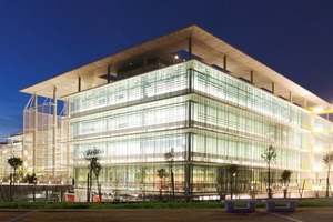 Zehn Minuten sind es mit dem Auto von der Innenstadt an den südlichen Stadtrand Sevillas. Vorbei an unfertigen Neubauvierteln schlängelt sich die Autobahn über ein grünes Rinnsal in einem betonierten Flussbett bis zu einer Felderlandschaft, die die Natur in ein gleichförmiges, grün-braunes Raster verwandelt. Ein geschundenes Stück Erde. Ausgerechnet hier fand ein Unternehmen für nachhaltige Informations-, Ingenieur- und Energietechnik seinen neuen Standort. Abengoa wurde vor 70 Jahren in Sevilla gegründet und ist heute mit mehreren Tochterunternehmen und über 20 000 Mitarbeitern weltweit tätig. Im Jahr 2005 plante Abengoa, die Hauptbüros aller Tochterfirmen an diesem Standort im Süden Sevillas zu bündeln. Die Architektur dafür entwarfen das Londoner Architekturbüro Rogers Stirk Harbour + Partner gemeinsam mit dem madrilenischen Büro Luis Vidal Associados Arquitectos. Dass für den Neubau alle Maßstäbe des nachhaltigen Bauens gelten sollten, war klar. Darüber hinaus wünschten sich die Bauherren einen Ort, der interdisziplinäres Arbeiten und Kommunikation zwischen den Mitarbeitern der unterschiedlichen Bereiche ermöglicht. Das Bauvolumen ist groß, rund 47 000 m² Bürofläche und weitere 3 500 m2 Multifunktionsflächen, dazu kommen 97 000 m2 Parkhaus. Die Organisation der Funktionen ist kein Problem, weder für Luis Vidal, der vor allem mit zahlreichen Flughafenprojekten an größere Maßstäbe gewöhnt ist, noch für RSH+P, die ohnehin auf viele größere Bauobjekte verweisen können. Wie aber ergänzt man ein solches Volumen rücksichtsvoll in die baumarme, flache Landschaft?