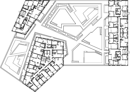 160 Wohnungen verteilen sich auf drei Gebäude über einem gemeinsamen Erdgeschoss-Sockel, der das gesamte Baufeld ausfüllt