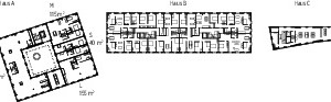 Montagebau als Leichtkonstruktion – Fassade: Ab 1. OG bis DG inkl. Innenhof Haus A: hinterlüftete Fassadenverkleidung aus Faserzementplatten roh und unbeschichtet. Unterkonstruktion: Holz mit Lattung und Konterlattung. Im Bereich EG-Nord gegen die Zollstraße sowie Haus A EG-West ist der opake Fassadenteil auf der Außenseite mit feuerverzinkten Stahlblechen beplankt. Die ganze EG-Fassade südseitig sowie beim Haus C ost- und nordseitig ist eine zweischalige Konstruktion mit vorfabrizierten Sichtbetonteilen außen.