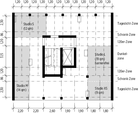 Das Studio S und zwei Studios M lassen sich hervorragend als kombiniertes Modul planen, das genau vier Achsfelder von je 120 cm ausfüllt. Das sind klassische Mikroapartments. Die Studios M eignen sich gut für Laubenganglösungen. Auch bei diesen Studios ist oberhalb des Badezimmers ein Luftraum mit einer lichten Höhe von 120 cm. Dieser Luftraum ist als Abstellfläche ausgewiesen. In Berliner Gründerzeitbauten mit ähnlich hohen Geschossen ist es gang und gäbe, Hochbetten einzuziehen. Der Luftraum oberhalb des Badezimmers erfüllt laut Berliner Bauordnung nicht die Anforderungen an einen Aufenthaltsraum. Auch wenn die Realität in den Gründerzeitwohnungen mit ähnlich hohen Decken das Gegenteil belegen, weisen wir unten Liegen von 90 cm Breite und 210 cm Länge nach, nebst kleinem Schreibtisch und kleinem Kleiderschrank. Auf diese Weise sind die Pläne baugenehmigungsfähig.