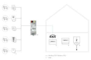 Mit dem Gira Eco lässt sich Elektromobilität in das Smart Home einfach und sicher einbinden und bis zu fünf Wallboxen unterschiedlicher Hersteller in ein KNX System integrieren. Der Gira Eco übernimmt das Lastmanagement, bei dem als Betriebsmodus das statische und das dynamische Lastmanagement zur Auswahl stehen. Beim statischen Lastmanagement wird der maximale Leistungsbedarf aller Ladepunkte einmalig festgelegt, und die verfügbare Leistung je nach Bedarf auf die Elektrofahrzeuge verteilt ohne die maximale Netzanschlussleistung zu überschreiten. Sollte im gesamten Gebäude allerdings weniger Strom als üblich verbraucht werden, kann die freigewordene Leistung nicht zur Ladung der E-Fahrzeuge genutzt werden. Das dynamische Lastmanagement überwacht durchgehend die Auslastung am Anschlusspunkt, bspw. dem elektronischen Haushaltszähler (eHz). Mithilfe der Messdaten wird das Lastprofil des Gebäudes berücksichtigt, sodass die Ladestationen optimal gesteuert werden können. So nutzt jede Ladestation die maximal verfügbare Leistung zum Laden der Elektrofahrzeuge. Bei geringerem Stromverbrauch kann überschüssige Leistung flexibel zum Laden der Elektrofahrzeuge eingesetzt werden oder zur Verteilung auf andere Ladestationen. Bei reduzierter Bereitstellung von Energie wird die Ladeleistung pro Fahrzeug angepasst, um die maximale Anschlussleistung nicht zu überschreiten.