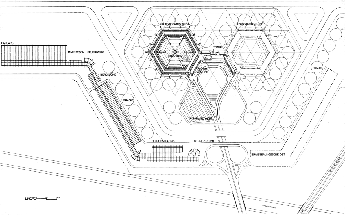 Oft erzählt ist die Geschichte, wie die beiden Gründer von gmp, Meinhard von Gerkan und Volkwin Marg, aus dem Stand den Wettbewerb für den Flughafen Berlin-Tegel gewannen und mit der Ausführung dieses Großprojekts betraut wurden. Seit Ende 2020 ist der Flughafen außer Betrieb und steht unter Denkmalschutz. Bereits seit 2008 hatten wir uns mit dem Umbau des Terminalgebäudes zu einer Hochschule mit Gründer- und Konferenzzentrum befasst. Die regelmäßigen, auf einem gleichseitigen Dreieck von 10 m Seitenlänge basierenden Grundrisse, die Meinhard von Gerkan und Volkwin Marg seinerzeit – ganz der strukturalistischen Denke entsprechend – für das Terminal TXL konzipierten, begünstigte eine Transformation in eine völlig andere Nutzung. Doch das Bedarfsprogramm, das vonseiten der Auftraggeberschaft und der Nutzenden als Grundlage des Entwurfs und der Planung gefordert wurde, bezog sich nicht auf die Maßsysteme des zu transformierenden Gebäudes, sondern spiegelte vielmehr allgemeine Vorgaben zur Hochschulplanung im Land Berlin wider.