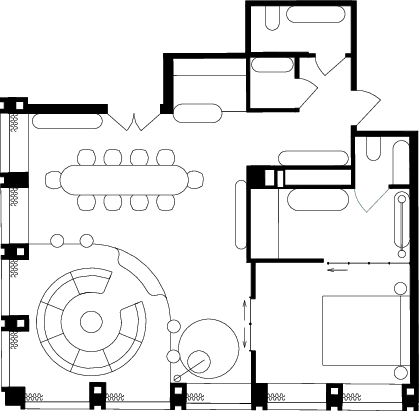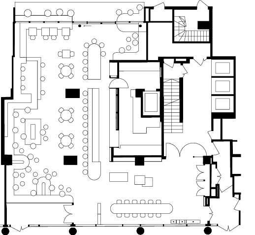 Im weitaus größeren ersten Obergeschoss, das auch ein Nachbargebäude miteinschließt, wurden ein neuer Seminar- und Konferenztrakt sowie unterschiedliche Sitz- und Lounge-Inseln geschaffen. Dabei wurde größter Wert auf leicht veränderbare Bestuhlungen gelegt, die nun in Verbindung mit verschiedenen Podienpodesten viele unterschiedliche Raumnutzungen und eine maximale Variabilität für Konzerte, Feiern, Diskussionen oder Vorträge ermöglichen. Nur bei der Wahl der Leuchtkörper musste studio aisslinger akzeptieren, dass der Auftraggeber in vielen Bereichen eine andere Lichtplanung mit günstigeren Leuchten bevorzugte.