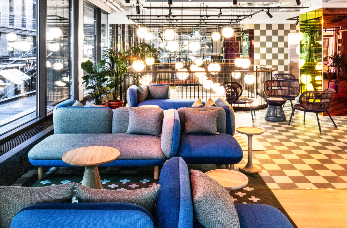 Gemeinsam mit dem finnischen Architekturbüro SARC Architects, die übrigens die neue Finnische Botschaft in Berlin bauten und aktuell das „Kämp” sanieren, entwickelte Werner Aisslinger ein sehr moderates Umbaukonzept für das Hobo Helsinki: mit wenigen Korrekturen der Erschließungen, der weitgehenden Übernahme der teilweise sehr ungewöhnlichen Zimmerzuschnitte und einem beherzten Freiräumen von EG und 1. OG für fließende Co-Working-, Gastronomie-, Seminar- und Konferenz- und Pop-up-Event-Nutzungen. Da das Erdgeschoss aufgrund einer separaten Ladengalerie nur eine recht kleine Grundfläche bot, wurde aus dem früheren Hotelempfang eine Bar, während der neue Empfang zur Straßenseite rückte und dort dank digitalem Check-In auf das Wesentliche reduziert gestaltet wurde.