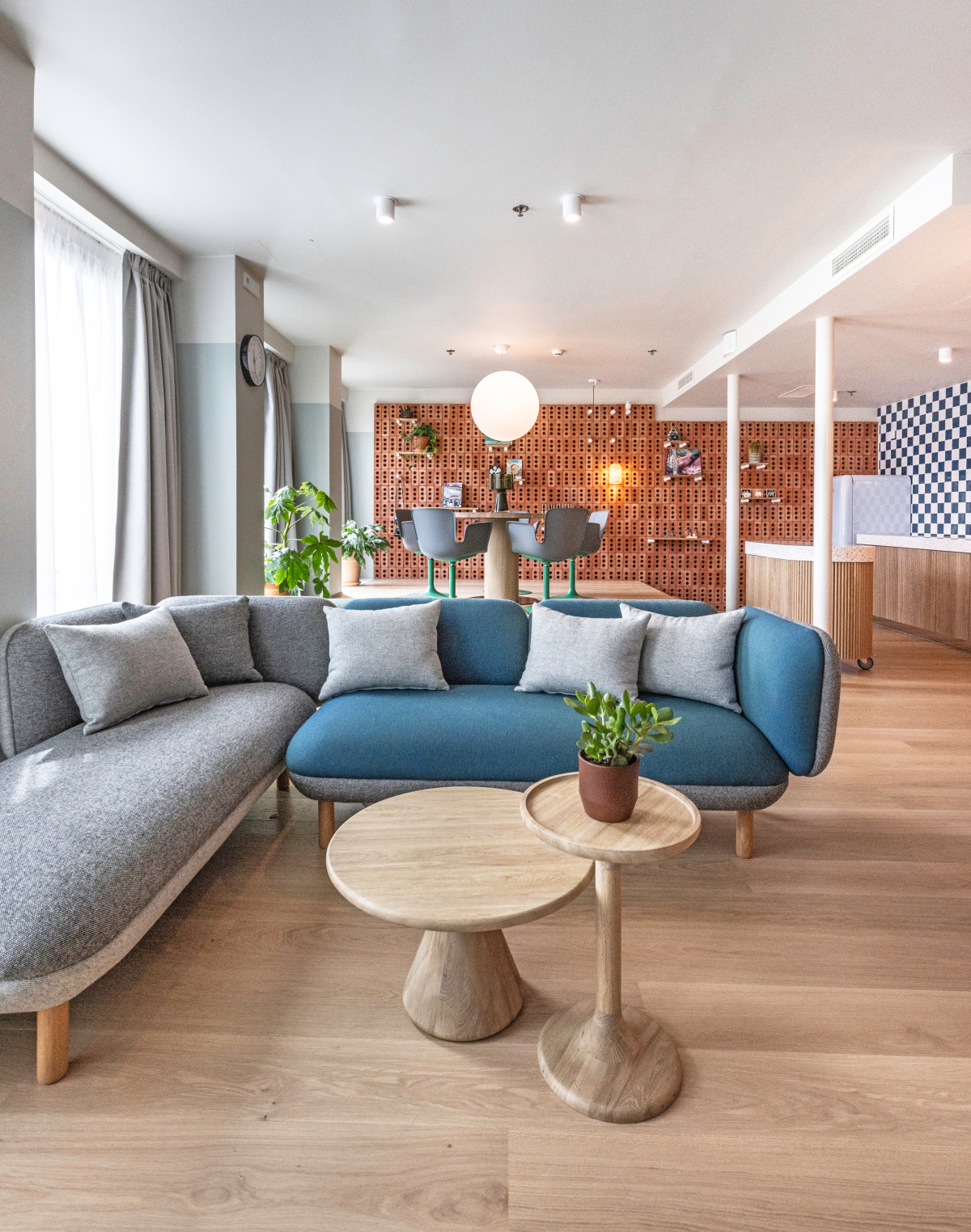 Im Erdgeschoss und in einigen Hotelzimmern wurden den Bestandswänden teilweise rote Retro-Lochziegel vorgebaut