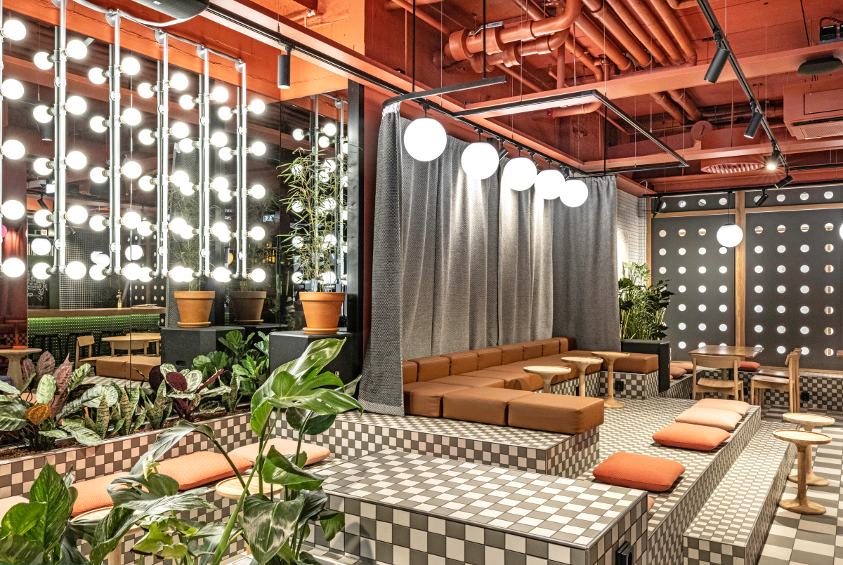 Mal kleinteilig, mal großformatig finden sich viele Muster auch in den Hotelzimmern wieder, wo schon einmal ein Vorhang hinter dem Bett ein Ziegelmuster tragen kann oder sich in den Badezimmern kontrastreich Fliesen in zweifarbigen Schachbrettmustern über Boden und Wände ausdehnen können. Dennoch überwiegt hier eher gestalterische Zurückhaltung mit klug gesetzten, oft transluzenten Raumteilern zwischen Schlaf- und Nassbereich, sparsam eingesetzten Sitz- und Ablagemöglichkeiten sowie dezenten Farbakzenten. Ruhe und Entspannung überwiegen hier im Kontrast zu den vielen möglichen Aktivitäten in den öffentlichen Bereichen von Hobo, die maximale Vernetzung und Kommunikation zu fördern versuchen.