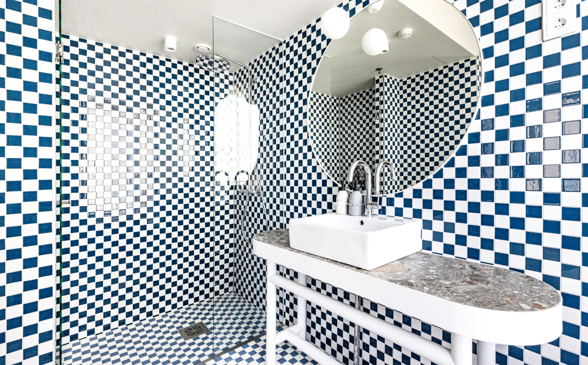 In den Badezimmern dehnen sich kontrastreich Fliesen in zweifarbigen Schachbrettmustern über Boden und Wände aus