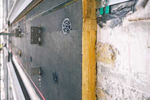 Die Ausführung begann mit der Montage der Wandkonsolen an die 250 mm starke STB-Außenwand. Anschließend wurde der Dämmstoff aus 2 x 80 mm Kontur FSP 1 Excellence an den Konsolen befestigt. Die zwei Dämmstofflagen wurden übereinander im Halbverband verlegt und anschließend mit fünf Dämmstoffhaltern