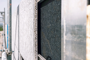 Der Untergrund aus alter Wärmedämmung, Ankern und schadhaftem Beton wurde ebenfalls abgebaut. Die vorsortierten Fassadenplatten aus Gneis wurden dann mittig durchgeschnitten, sodass aus einer Natursteinplatte zwei dünnere wurden. Jede Platte wurde dann gemäß der Litho-Stone zugehörigen allgemeinen bauaufsichtlichen Zulassung mit einer Leichtbetonträgerplatte Vakuum-verklebt und geschliffen. Das so upgecycelte Fassadenelement ist 28 mm stark, davon macht die Natursteinplatte 10 bis 12 mm aus, wobei die an der Natursteinfassade auftretenden Kräfte durch das Verbundsystem geschlossen aufgenommen werden.