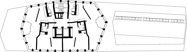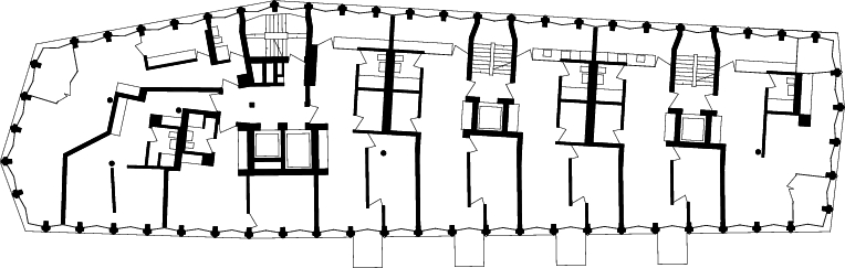 Die etwas schräg gestellten Wände der Wohnungen sorgen für interessante Raumengen und -aufweitungen entlang der Fassade und greifen damit die mehrwinklige Grundfigur des Gebäudes auf. Nach oben sind die Innenwände über breitere Fugen angeschlossen, die Durchbiegungen der Decke abfangen können. Gerade in Wohnungen, die keine Innentüren haben, sprechen die klare Primärstruktur, die freistehenden Stützen und nicht zuletzt das Mieterpublikum für einen solchen Ansatz, der zusätzliche Varianz ermöglicht. Unabhängig gesetzt, weil Teil der Sekundärstruktur, sind hingegen die technischen Installationen wie Leitungen, Fußbodenheizung und die Lüftung. Sollten die Etagen wirklich eines Tages neu aufgeteilt werden, könnten diese Elemente von der Primärstruktur gelöst und bedarfsentsprechend aufgebaut werden.