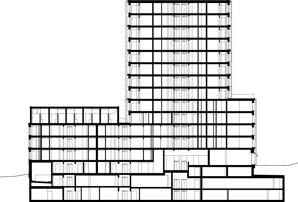 In Anbetracht des abfallenden Terrains vermittelt der Sockel des Triemli den Höhenunterschied über zwei Geschosse, wobei der Turm, der eben nicht auf der Ecke sitzt, den Versprung aufnimmt